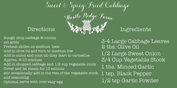 My mother used to make fried cabbage from time to time but she fried it deep in bacon grease. I loved it then and miss it now. So I went to the garden to trim up some of the oversized greens. When cabbage is planted in soil thats very high in nitrogen it’ll put more energy into growing greens then it will making heads. So its best to trim back those larger greens every now and again. But you don’t have to throw them away!! They are wonderful to throw into vegetable stock, fry or feed your chickens!